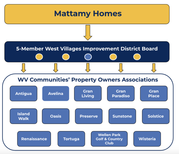 As the majority landowner, Toronto-based homebuilder Mattamy Homes appoints four of the five members of the West Villages Improvement District Board, the special-purpose government that manages infrastructure and services across all of Wellen Park –– previously called West Villages. The other board member is a property owner from one of the 14 communities inside Wellen Park. | Chart by Suncoast Searchlight