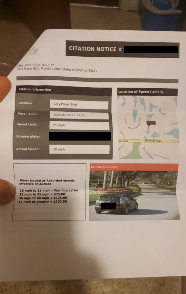As the driver made his way through the community entrance, a camera inside the private subdivision captured the car going 39 mph. The speed limit was only 25 mph. Within a month, an unusual citation arrived in the mail demanding $125 — issued not from police or the sheriff’s office, but from the neighborhood HOA that controls the street.