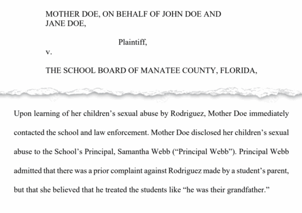 According to a lawsuit, settled in October, when a mother reported alleged sexual abuse by teacher’s aide, the principal said there had been a prior complaint about him touching a student but allegedly brushed it off. | Suncoast Searchlight illustration from the lawsuit