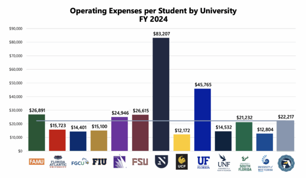 Image from the Florida State University System Efficiency Study showing New College with the highest costs per student, a figure that was derived by dividing operating expenses for each university by its student enrollment.