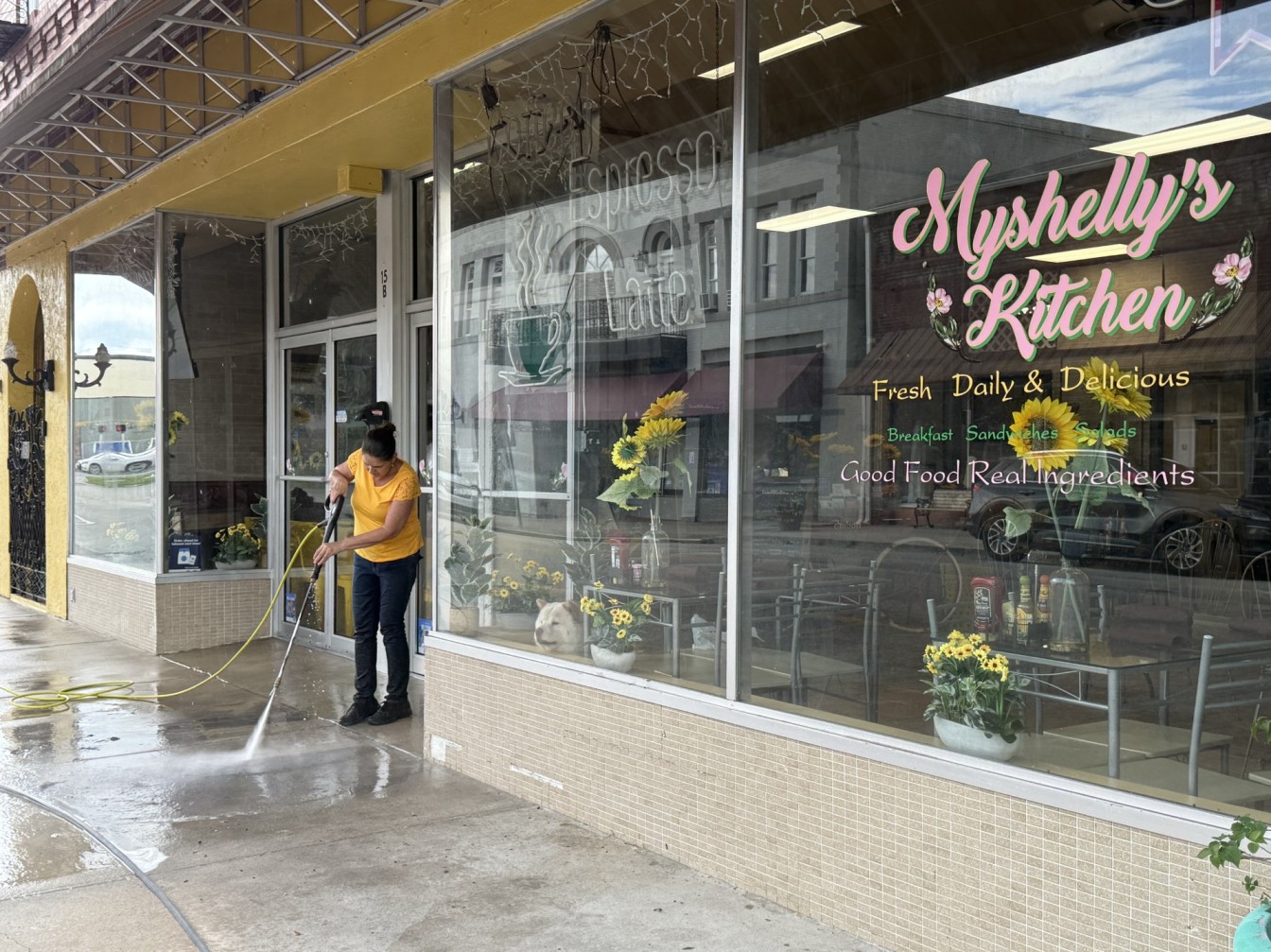 Michelle Miller pressure washes the sidewalks outside Myshelly’s Kitchen on September 11, 2025, after a slow day at her restaurant in the slowest summer she’s seen since opening eight years ago. Miller blamed her current business woes on roadwork that dragged on for more than two years. | Photo by Derek Gilliam, Suncoast Searchlight
