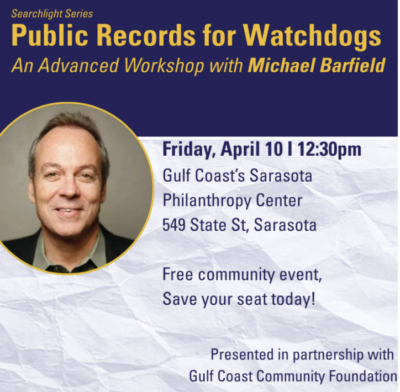 1-2:15 p.m., March 31 at Manatee Community Foundation in Bradenton. Lunch provided. Registration required; register here. - Public Records for Watchdogs: An advanced public records workshop