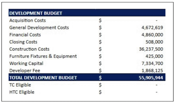 The pro forma for the city’s proposed affordable housing project estimated the entire development would cost nearly $56 million, with about $36 million of it funding construction alone. | Image from the city’s pro forma