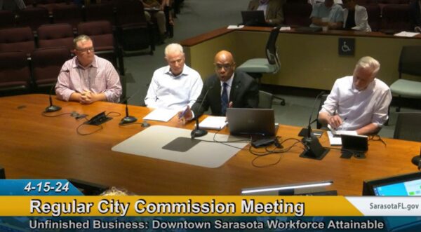 Steve Horn, Ian Black, Marlon Brown and Chris Gallagher (of Hoyt Architects) answered questions from city commissioners during the an April 15, 2024, meeting. The City Commission unanimously voted to move forward with buying the 1st Street properties after the discussion. | Image from City of Sarasota video