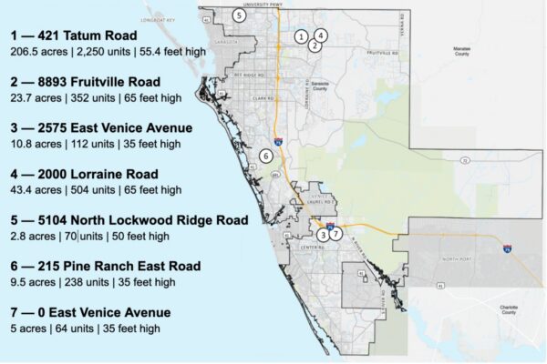 Sarasota County has received seven Live Local applications since September. They range from a 100-unit apartment complex near Venice to a 2,280-unit multifamily development on Tatum Ridge Road. | Suncoast Searchlight illustration using a Sarasota County map