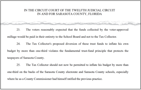 The Sarasota County School Board is suing Tax Collector Mike Moran and the constitutional office he controls alleging “unlawful diversion” of taxpayer funds that were supposed to support local students. | Suncoast Searchlight illustration based on the actual lawsuit