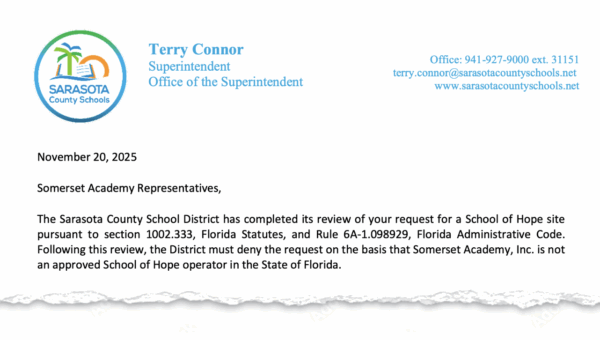 Sarasota also denied Somerset outright because it’s not an approved Schools of Hope operator; Manatee did not respond to Somerset at all for the same reason.