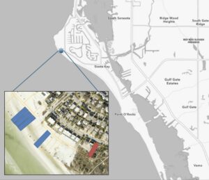 As part of a settlement agreement, Sarasota County approved a land swap involving a parcel it purchased in 2017 (in red) and four lots owned by Siesta Beach Lots (in blue). The deal also required the county to grant a variance allowing Siesta Beach Lots owner Michael Holderness to build a home on the red parcel. | Illustration by Suncoast Searchlight using a Sarasota County maps.