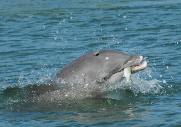 An adult male Sarasota Bay resident dolphin named Riptorn captures a mullet. Researchers have found microplastics in 100% of breath samples collected from local dolphins, along with widespread presence in their digestive systems. | Photo by Sarasota Dolphin Research Program taken under NMFS Scientific Research Permit