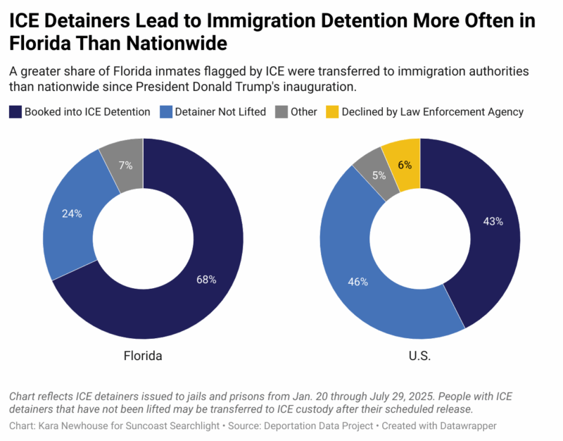 More than two-thirds of detainers issued in Florida after Jan. 20 led to ICE detention by late July. That’s a higher share than in the nationwide pool of detainers.