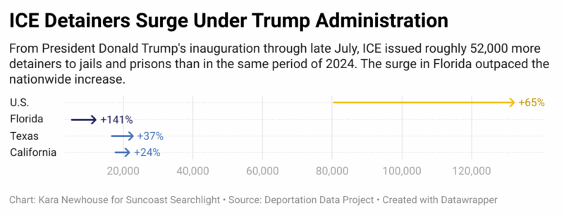 ICE issued over 130,000 detainers to jails and prisons nationwide between Trump’s inauguration and late July. That’s a 65% increase, but in Florida the increase was greater. ICE detainers here more than doubled compared with the same period last year, according to a Suncoast Searchlight analysis of federal data.