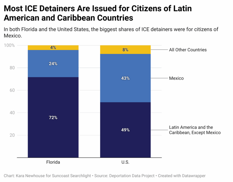The vast majority of people with ICE detainers in Florida and nationwide since Trump’s inauguration had citizenship in Latin American and Caribbean countries.