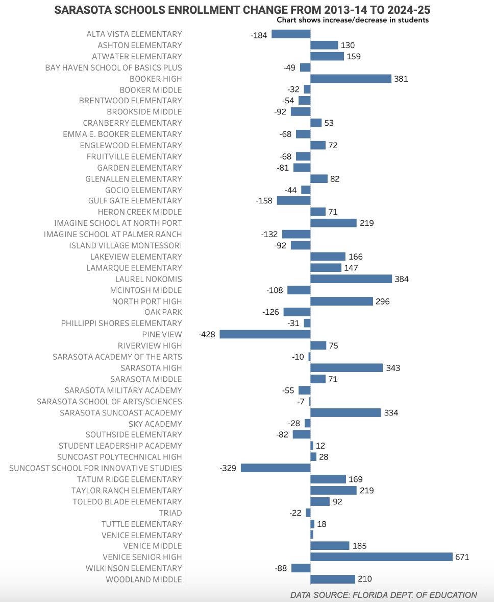 Despite countywide population growth, a Suncoast Searchlight review of state enrollment data found that more than 20 other Sarasota schools have steadily lost students for more than a decade, including some of the district’s most prestigious and top-ranked campuses, like Pine View School for the Gifted.